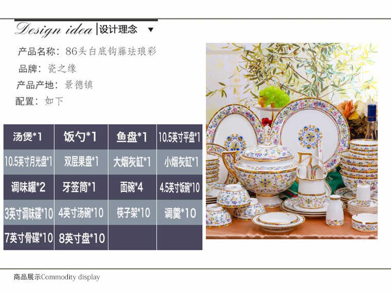 86頭白底鉤藤琺瑯彩,一個(gè)湯煲,一個(gè)飯勺,一個(gè)魚盤,一個(gè)10.5寸平盤,一個(gè)10.5寸月光盤,雙層果盤一個(gè),一個(gè)大煙缸,一個(gè)小煙缸,二個(gè)調(diào)料罐,一個(gè)牙簽筒,四個(gè)面碗,十個(gè)4.5寸飯碗,十個(gè)三寸調(diào)味碟,十個(gè)4寸湯碗,十個(gè)調(diào)羹,十個(gè)7寸骨碟,十個(gè)8寸盤,十個(gè)筷子架。