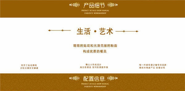 65頭醉花吟,一個湯煲,一個魚盤,一個大飯勺,一個大湯碗,一個牙簽筒,六個面碗,四個三寸碟,十個盤子,十個4.5寸飯碗,十個五寸骨碟,十個調(diào)羹,十個筷子架。