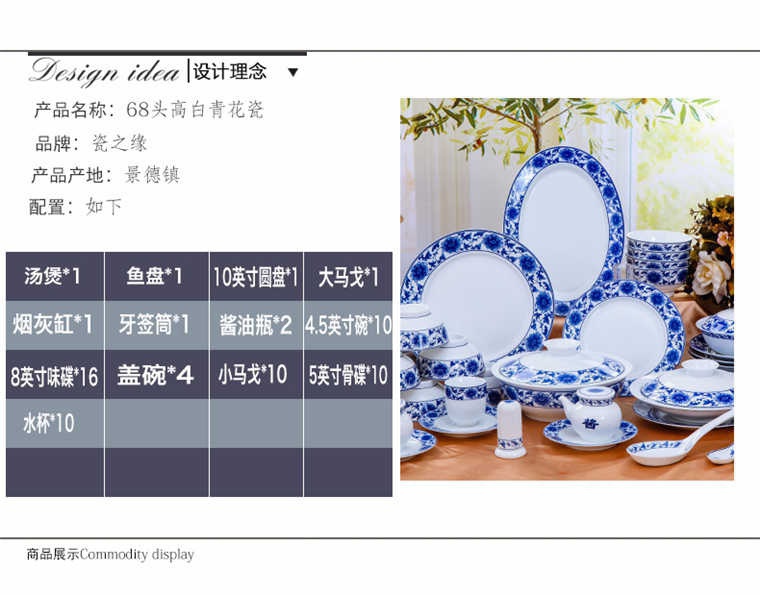 68頭高白青花瓷,一個(gè)湯煲,一個(gè)魚盤,一個(gè)10寸圓盤,一個(gè)大馬戈,一個(gè)煙缸,一個(gè)牙簽筒,兩個(gè)醬醋瓶,十個(gè)4.5寸碗,十六個(gè)8寸碟,四個(gè)蓋碗,十個(gè)小馬戈,十個(gè)5寸骨碟,十個(gè)水杯。