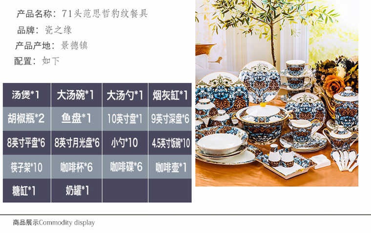 71頭范思哲豹紋餐具,一個(gè)湯煲,一個(gè)大湯碗,一個(gè)大湯勺,一個(gè)煙缸,兩個(gè)胡椒瓶,一個(gè)魚盤,一個(gè)10寸盤,六個(gè)9寸深盤,六個(gè)8寸平盤,六個(gè)8寸月光盤,十個(gè)4.5寸飯碗,十個(gè)小勺,十個(gè)筷子架,一個(gè)咖啡壺,一個(gè)糖缸,一個(gè)奶罐,六個(gè)咖啡杯,六個(gè)碟。